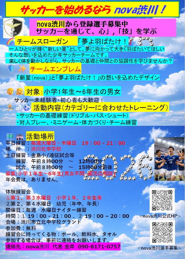 群馬県渋川市にある少年サッカーチームの「nova渋川(ノヴァ シブカワ)」です。