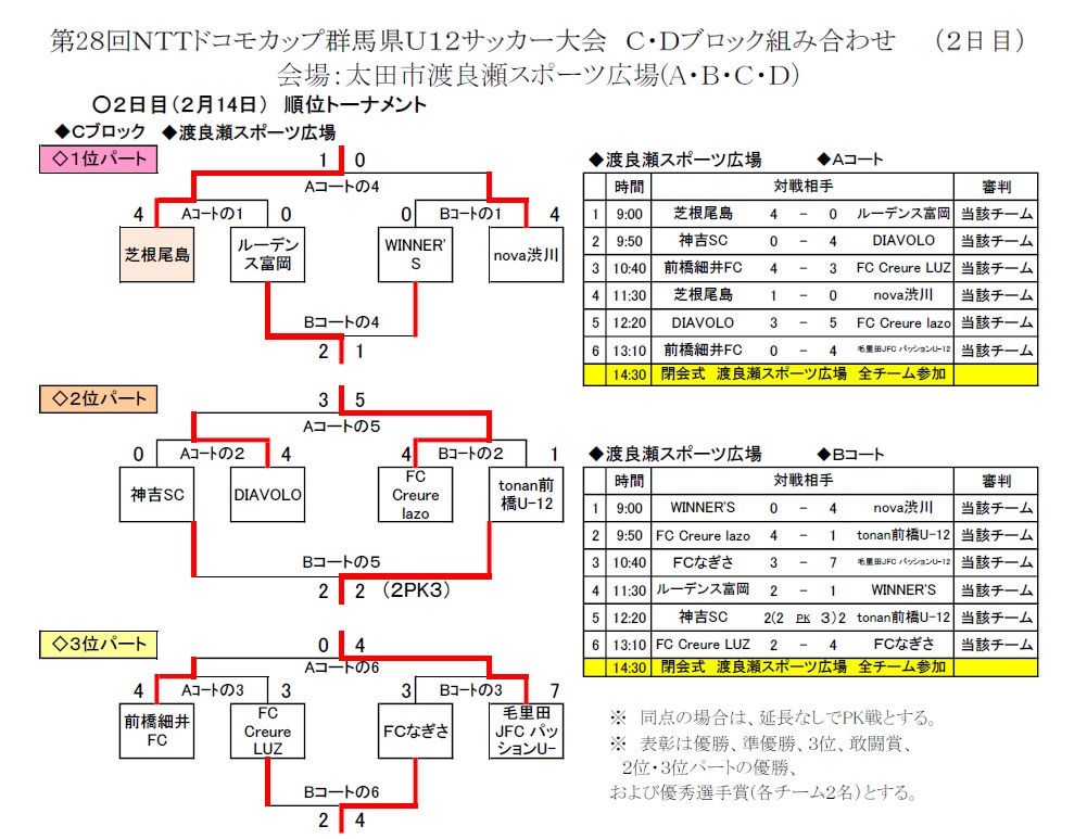 Cブロック 1位パートの結果 nova渋川は、Cブロック 1位パート 2位で終了しました。 選手のみなさん、お疲れ様でした、優勝できなかった悔しさは、最後のスーパードリームカップで頑張りましょう。 保護者のみなさん、応援ありがとうございました。 第28回__ドコモカップ組合表(8会場)95チーム広報用(2026年2月14日、最終結果)(ここをクリックするとファイルが開きます)