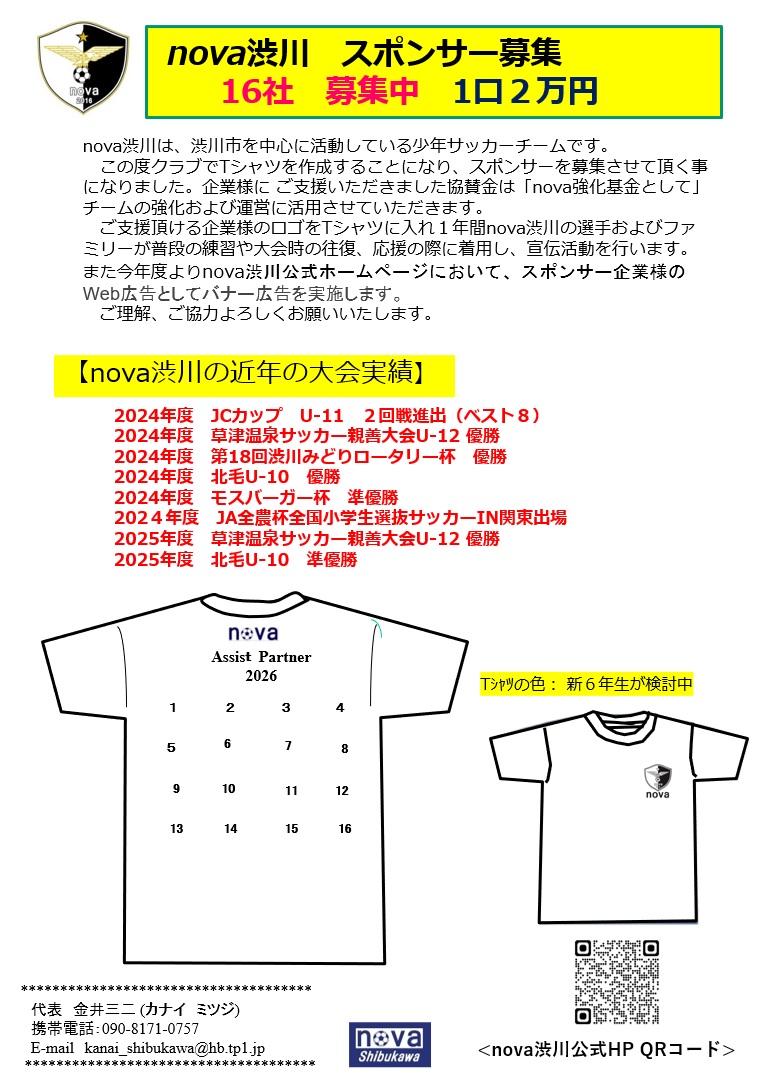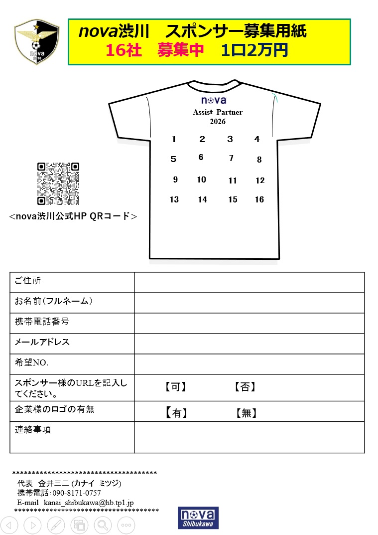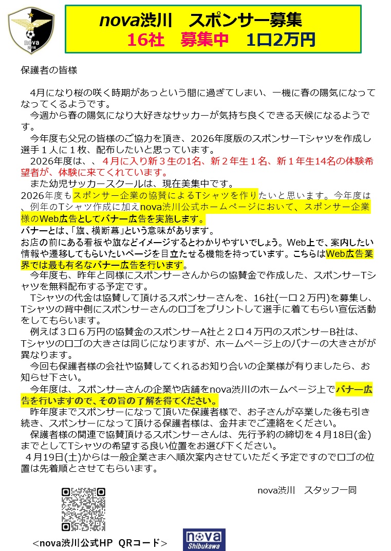 今年度は、スポンサーさんの企業や店舗をnova渋川のホームページ上でバナー広告を行いますので、その旨の了解を得てください。